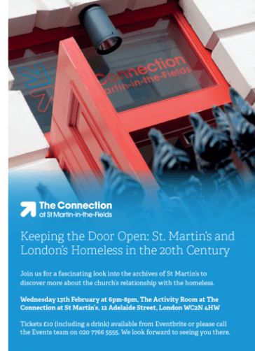 Keeping the Doors Open: St Martin’s and London’s Homeless in the 20th Century, 6-8pm, 13th February 2019, at The Connection at St Martin’s, Adelaide Street, London WC2N 4HW.