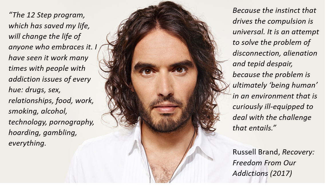 In my last job, I was based in a church building which hosted a huge range of 12 Step recovery groups in its basement. The most famous of these is Alcoholics Anonymous (AA), but there were also groups specifically for people struggling with many of the compulsive behaviours that Brand lists above.
