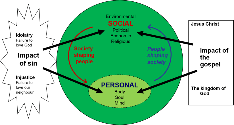 The important theological point the diagram makes is that sin affects both individual people and social structures. Both human hearts and political and economic structures are twisted by the failure to love God and love our neighbour.