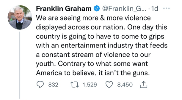 But Graham does identify a more corporate target. The manufacturers and marketeers of firearms? The NRA and the gun lobby who fund so many politicians? No, he blames the entertainment industry for the violence: