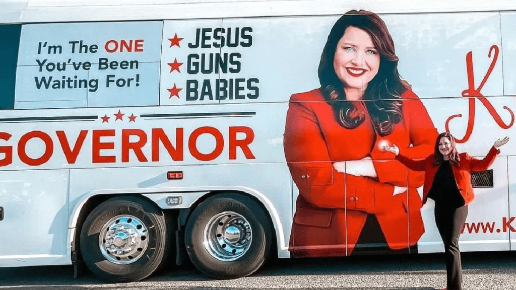 It would be hard to find a more succinct summary of the polarisation of religion and politics than the campaign bus of Kandiss Taylor who is running for Governor in Georgia.