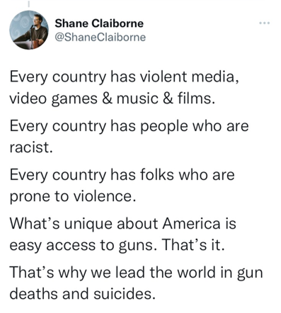 Most social problems stem from the idolatry of power, money and sex. So many Americans see guns as not just a tool for self defence but a symbol of power. It’s so disappointing when Christians fail to call out this idolatry (of whatever kind) and the result is always child sacrifice, just as it was in OT times whether that is children in poverty or killed in classrooms or the womb.