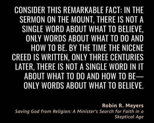 2. I do agree with your emphasis on the priority of both action and belief – however, comparing a summary of key teachings (sermon on the mount) with a credal statement is a little unfair on the latter… dare I say disingenuous…. That said, I agree the creed sorely lacks many many things, because of the heresies it was countering. In a way, a bit like Paul’s letters…