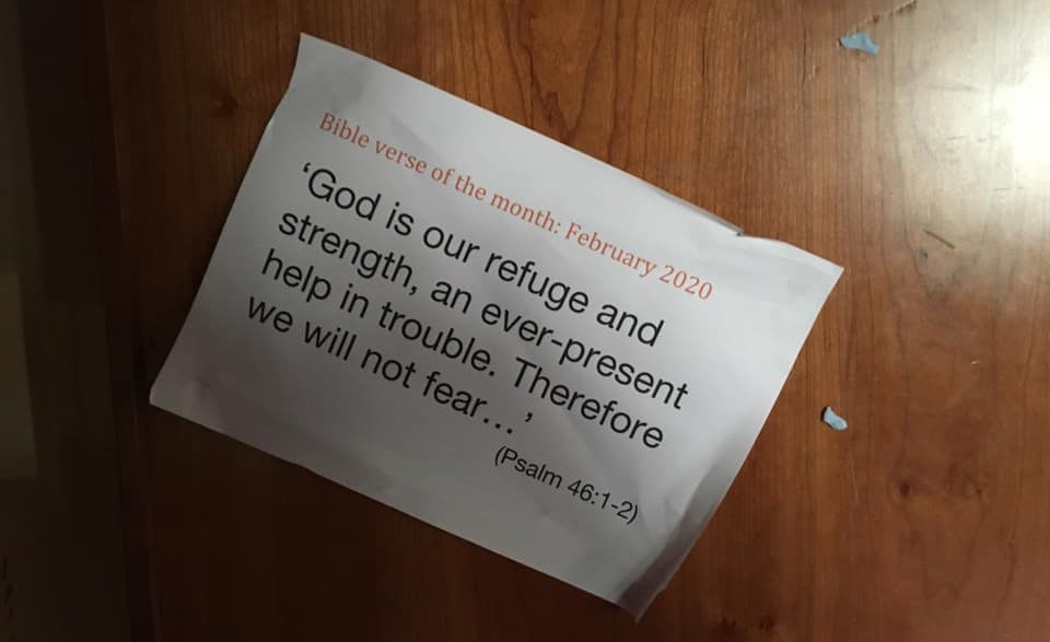 As night descended my fellow volunteer and I completed our tasks. We reflected on the pandemic and what it would all mean. In the hall a battered piece of paper, half-hanging off the door caught my eye. It was a passage from Psalm 46:1–2: