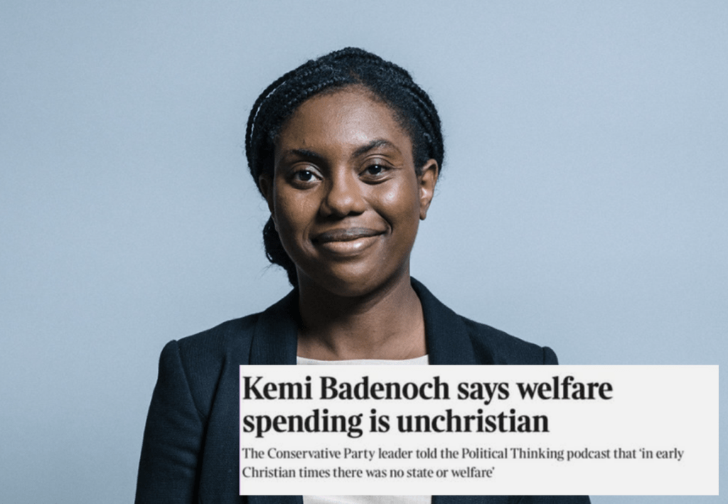 The leader of the Conservative Party, Kemi Badenoch, was asked in an interview whether welfare spending was unchristian and she replied: