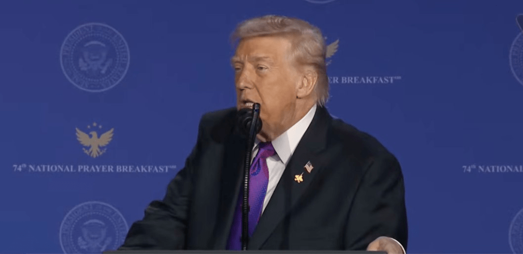 Trump wandered into the National Prayer Breakfast like a man who’d accidentally been scheduled for a revival service in between a rally and a grievance deposition, and proceeded to deliver what can only be described as a theological Mad Libs stitched together with ego, revenge fantasies, and intermittent references to God as a kind of celestial brand sponsor.