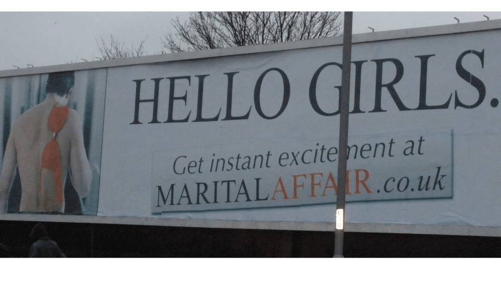 I wondered what he was reading or what he had been hearing in the playground. But he was pointing to this massive billboard on the junction for a website called Marital Affair with this image, promising ‘instant excitement’.